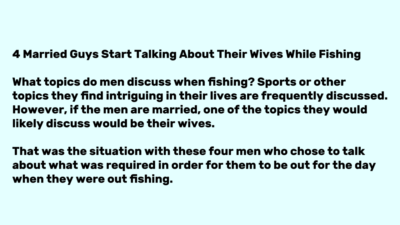 What topics do men discuss when fishing? Sports or other topics they find intriguing in their lives are frequently discussed. However, if the men are married, one of the topics they would likely discuss would be their wives.