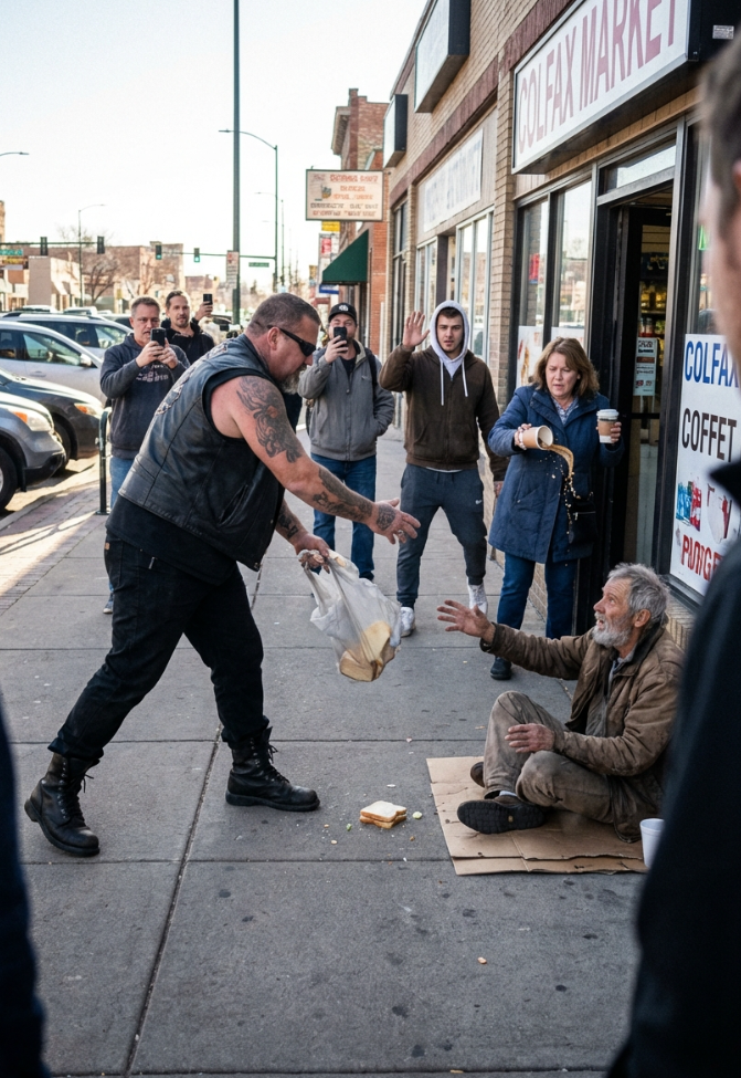 People started shouting when a biker suddenly ripped a bag of food from a homeless man and threw it onto the pavement—“What the hell is wrong with you?!”—but what had he seen that no one else did?