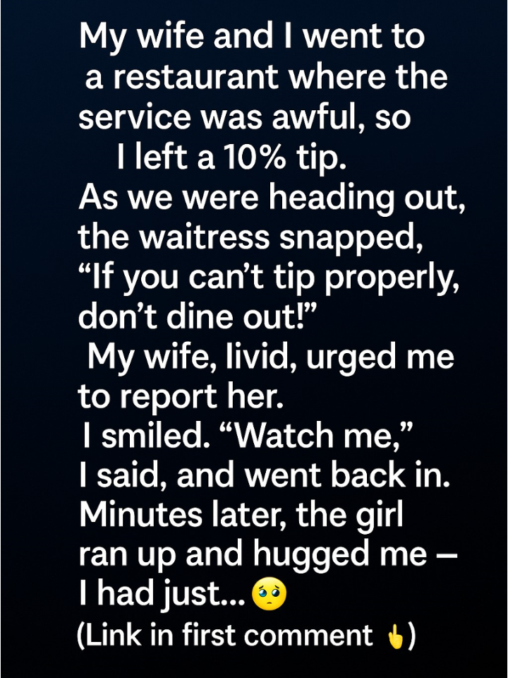 My wife and I had gone out for what we hoped would be a relaxing dinner, but the evening unfolded differently than we expected. The service was slow, the waitress seemed distracted, and our food took ages to arrive. When the bill came, I left a 10% tip β not out of anger, just honesty about the experience.