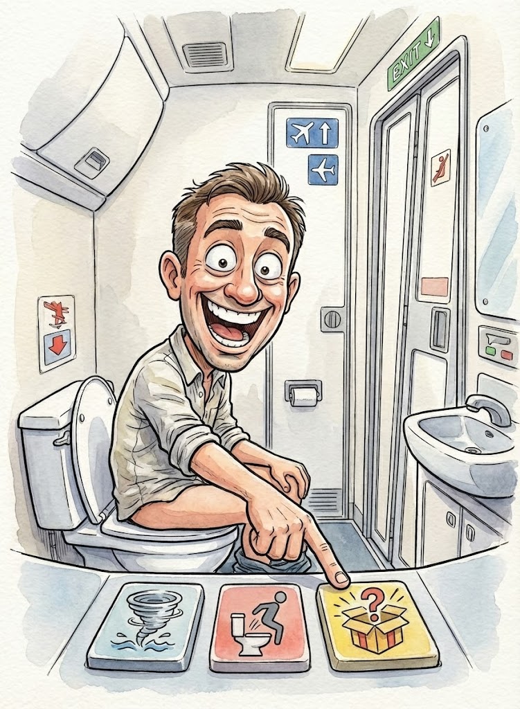 Finally sitting on the toilet he noticed the buttons on the wall next to him. He couldn’t resist, and pressed …