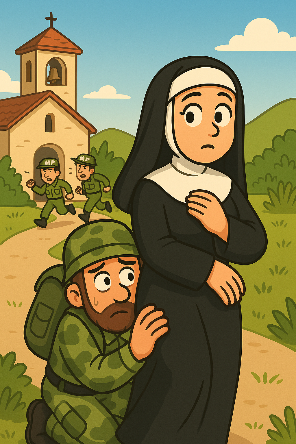 Out of breath, he asked, “Please, may I hide under your skirt? I’ll explain later.” The nun agreed… A moment later two Military Police ran up and asked, “Sister, have you seen a soldier?”
