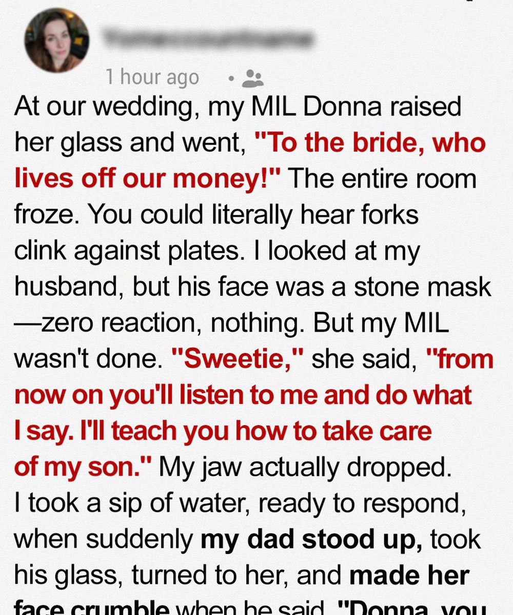 At what was supposed to be the happiest day of my life, my mother-in-law stood up to give a toast — and in front of 200 guests, she delivered a single, cruel remark: “To the bride, who lives off our money!”. My husband sat there in silence, but just as I felt myself crumbling, my father stood — and what he said flipped …