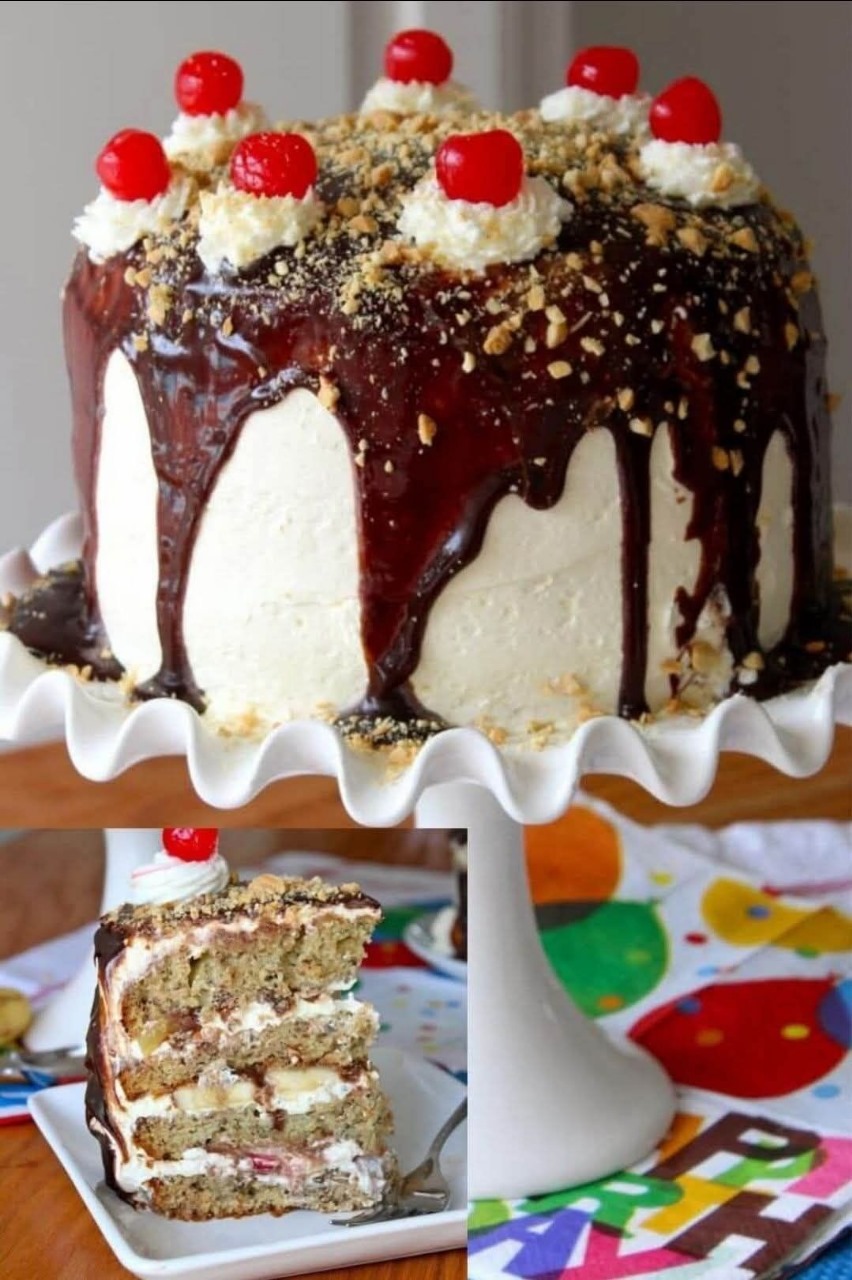 This incredible cake has banana split bliss in every bite! Moist banana nut cake is layered with all the incredible toppings of a traditional banana split.