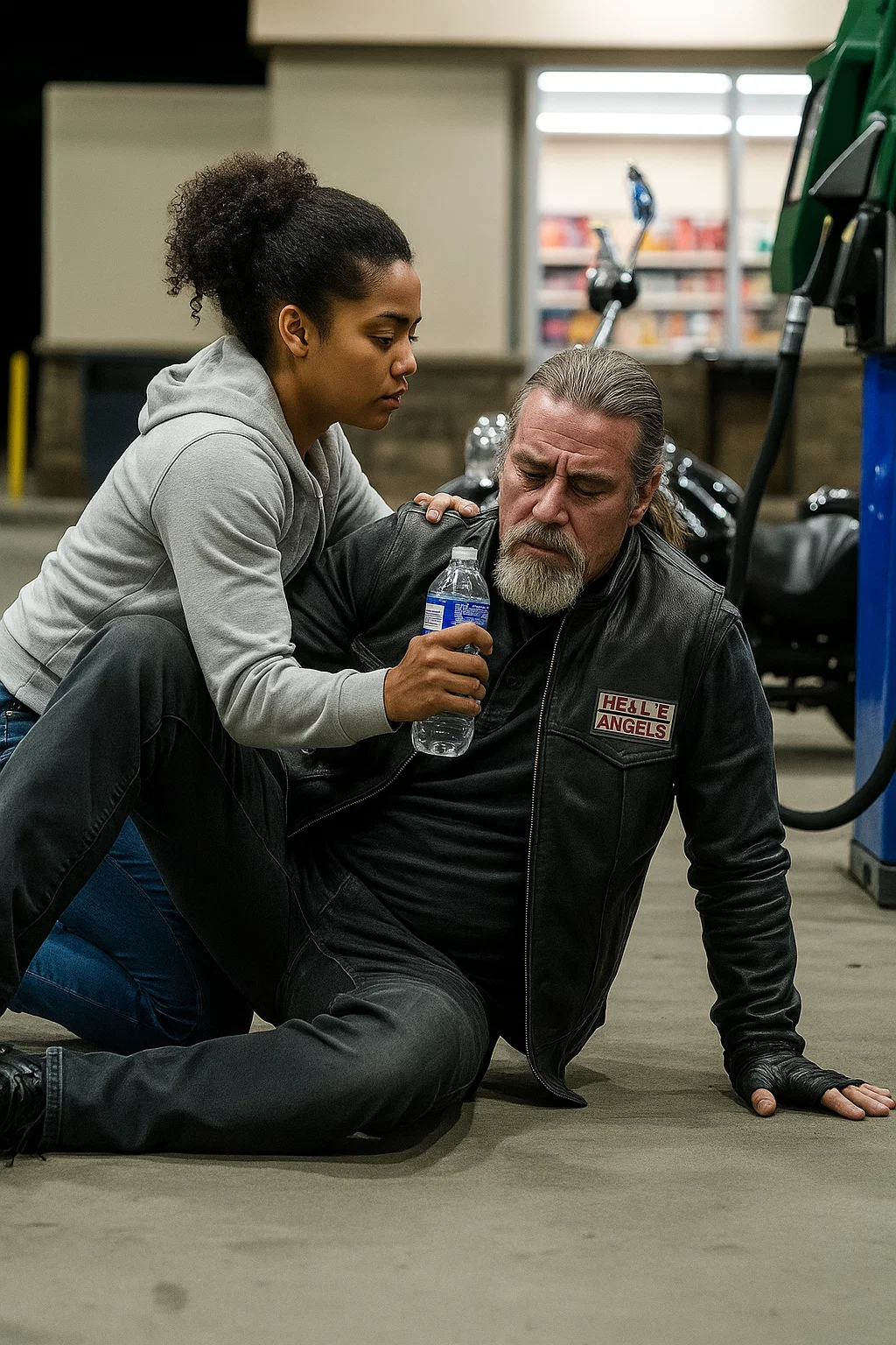Nearby, a large biker wearing a Hell’s Angels …