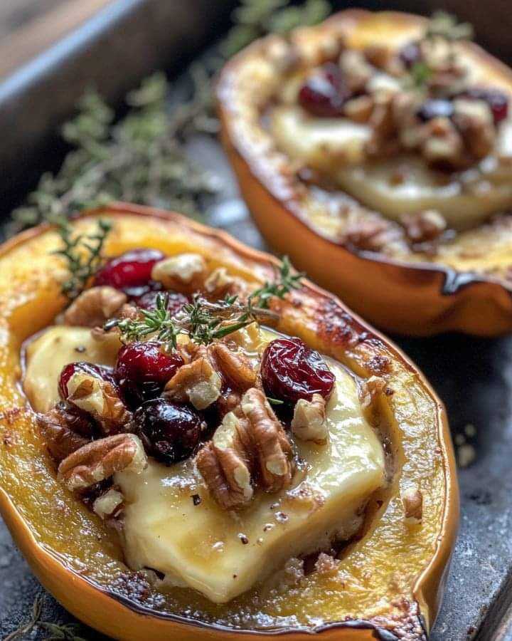This Brie-Stuffed Acorn Squash is a delightful combination of savory and sweet flavors. The roasted acorn squash serves as the perfect vessel for creamy Brie, tangy dried cranberries, and crunchy walnuts. Drizzled with maple syrup and topped with a sprinkle of fresh thyme, this dish makes for an elegant side or a cozy main course, especially during the holidays.