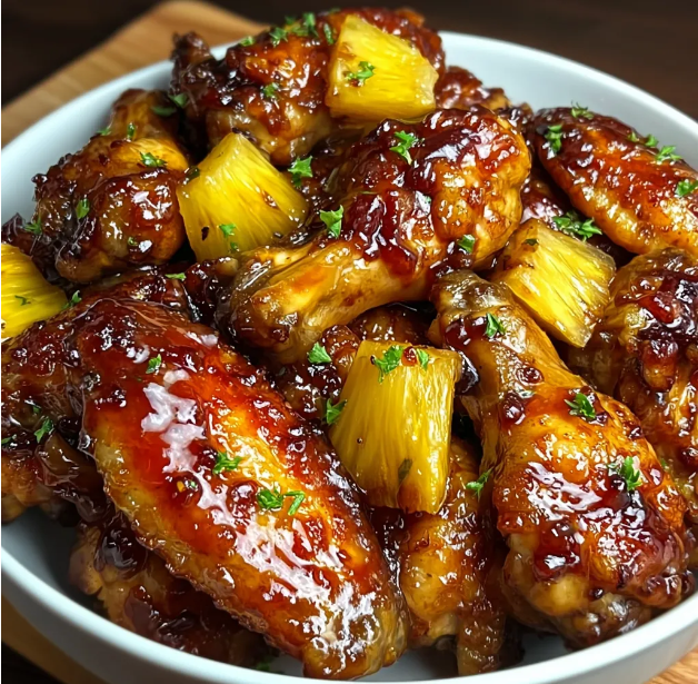 Once the wings are done, transfer them to a large serving bowl and pour that warm, sticky pineapple glaze all over them. Toss everything together until the wings are completely coated, then serve immediately while they’re hot and glossy.
