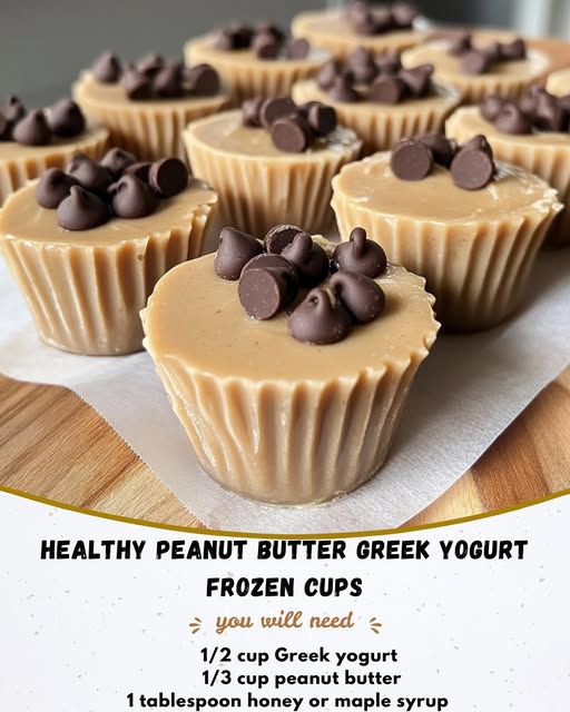 Healthy Peanut Butter Greek Yogurt Frozen Cups Ingredients: 1/2 cup Greek yogurt 1/3 cup peanut butter 1 tablespoon honey or maple syrup 1/4 teaspoon vanilla extract 1–2 tablespoons mini chocolate chips (optional) Directions: see continuation on next page