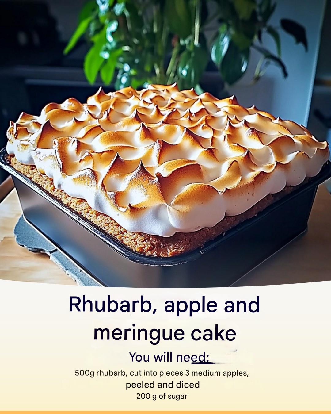 Ingredients: 500g rhubarb, cut into pieces 3 medium apples, peeled and diced 200g sugar 250g wheat flour 150g butter, at room temperature 3 eggs 1 teaspoon baking powder 1 teaspoon cinnamon Pinch of salt 3 egg whites 150g icing sugar Instructions: see continuation on next page