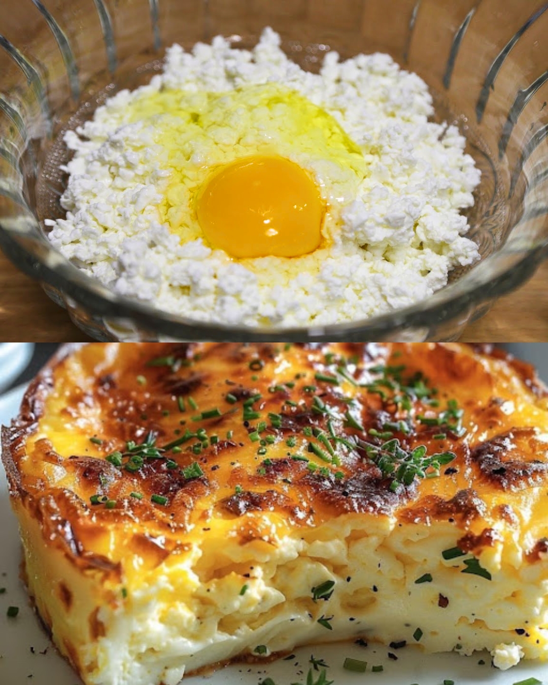 In a separate bowl, mix together the cottage cheese, cheddar cheese, Parmesan cheese, flour, melted butter, baking powder, and salt.