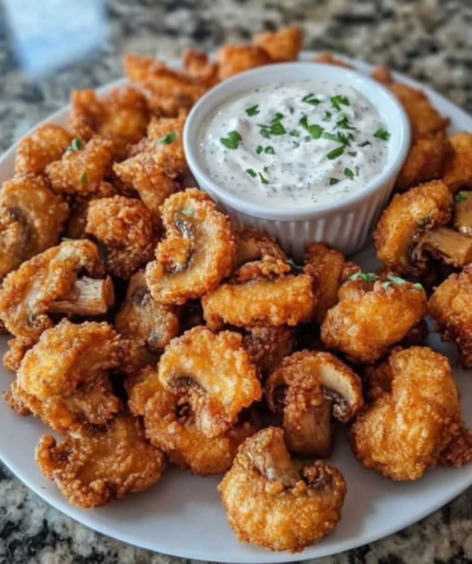 Get ready for a crunchy, savory treat with these Crispy Fried Mushrooms! Served alongside a refreshing Cool Ranch Dip, these golden-battered mushrooms are perfect for a snack, appetizer, or party platter.