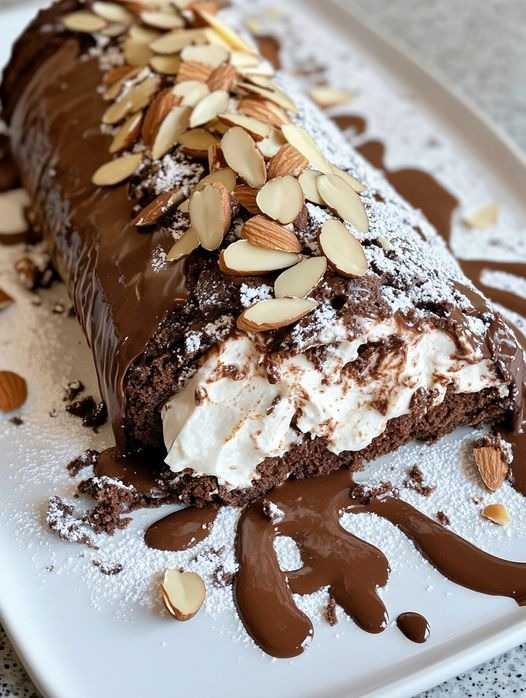Elegance in every slice: rich roll of cream and chocolate almonds