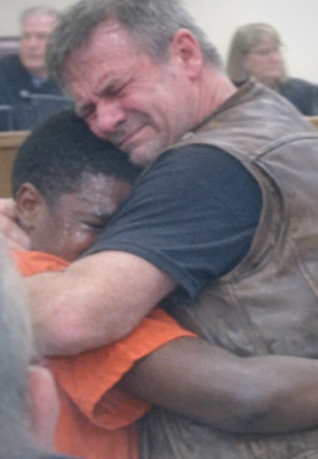 I was standing in that courtroom wearing my leather vest, holding a sixteen-year-old boy in an orange jumpsuit while an entire room stared in disbelief. Marcus clung to me, shaking, his face buried in my chest. The judge looked bewildered, the prosecutor looked outraged, and my wife was crying quietly on the back row.
