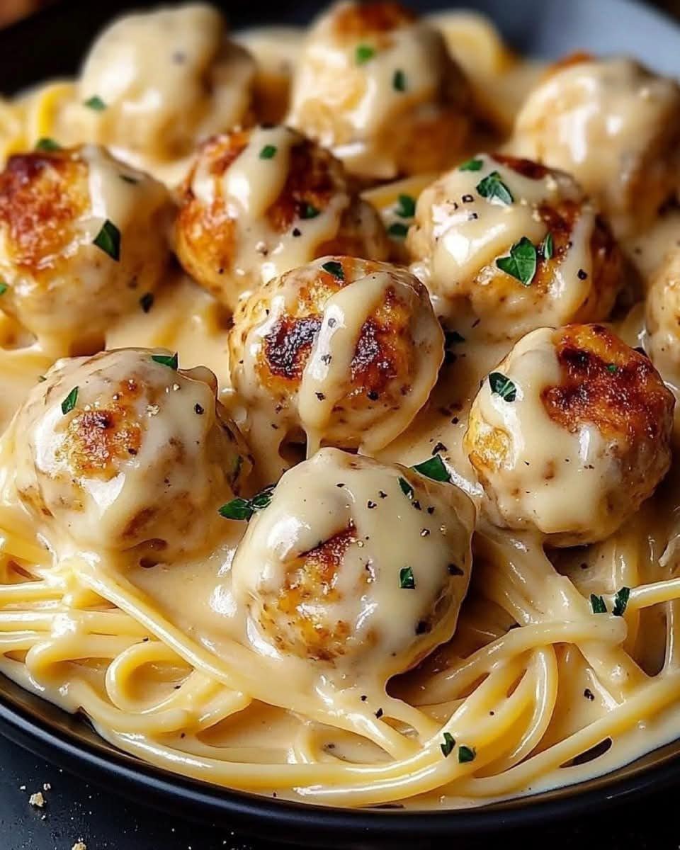 Perfect Comfort Food: A creamy pasta dish with homemade chicken balls makes for a satisfying and hearty meal.