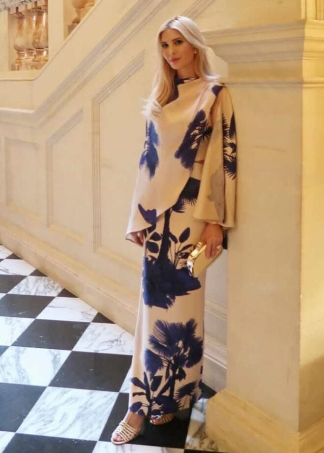Ivanka Trump, 43, turned heads in London while accompanying her father, former President Donald Trump, on his diplomatic trip to the UK and Scotland. On Saturday, she shared an Instagram photo taken in the elegant corridors of a London venue. Wearing the Ocean of Secrets Maxi Dress by Colombian designer Johanna Ortiz, the beige-and-navy gown featured a palm print and matching wrap. Her caption simply read, “Evening pending.”