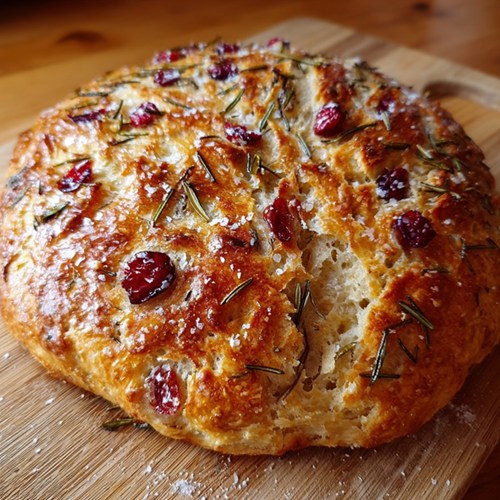 If you’ve ever dreamed of baking bakery-style bread at home with minimal effort, this no-knead rosemary cranberry bread is the recipe for you. The long rise gives it that classic artisan flavor, while the Dutch oven technique creates the perfect crust. The tart cranberries add sweetness, rosemary brings a savory, aromatic touch, and the olive oil with sea salt finish makes it irresistible.