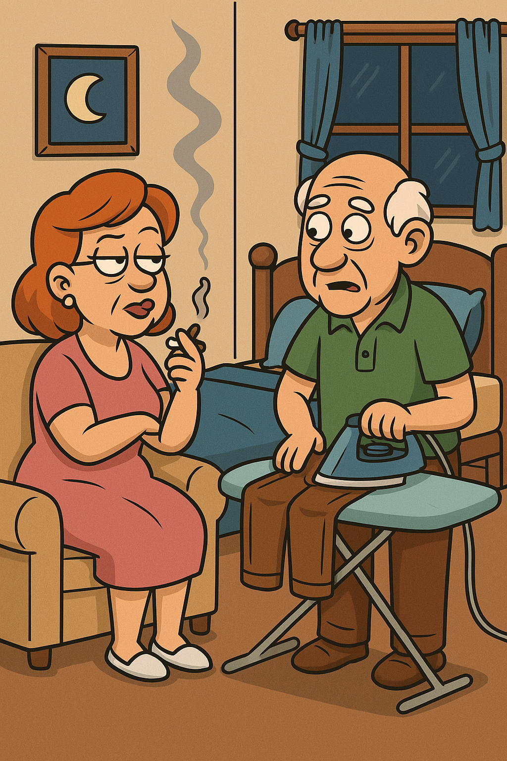 After 37 years of marriage, Edna had just about enough of Harold’s routine: dinner at five, the news at six, grumbling by seven, and asleep by eight — snoring like a broken lawnmower.