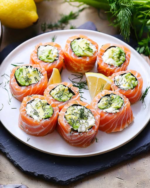 A refined and balanced recipe, perfect for an aperitif or starter. These rolls combine the delicate flavors of smoked salmon with a creamy filling of avocado and fresh herbs. ๐Ÿฅ‚