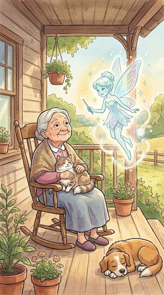 An old lady sits on her front porch, rocking away the last days of her long life, when all of a sudden, a fairy godmother appears and informs her that she will be granted three wishes.
